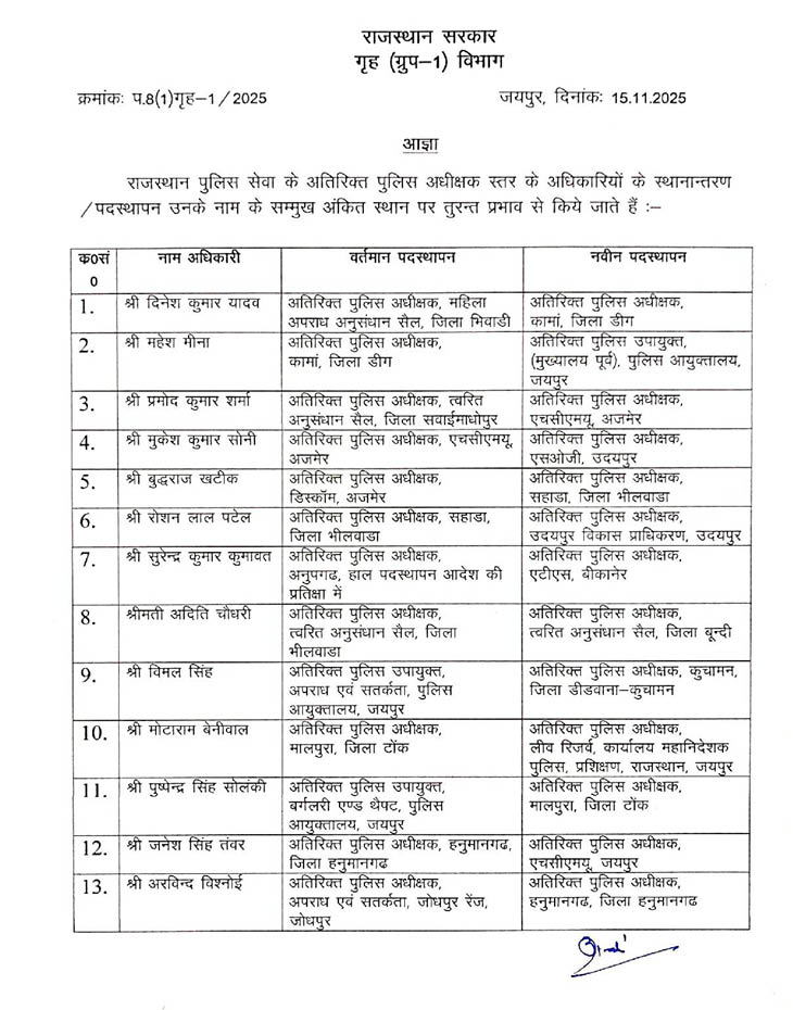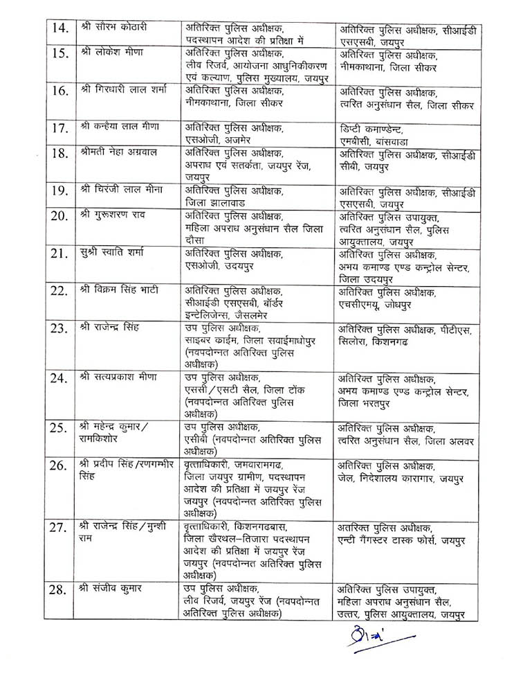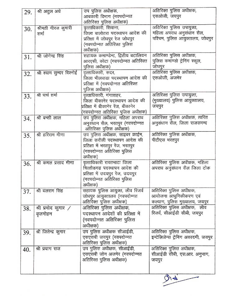 वहीं अजमेर में डिप्टी कमांडेंट हाडीरानी महिला बटालियन की प्रीति कांकाणी को डिप्टी कमांडेंट पदमिनी महिला बटालियन सीकर और जयपुर के अतिरिक्त पुलिस अधीक्षक (पुलिस अधीक्षक केंद्रीय भंडार पुलिस मुख्यालय) के यशपाल त्रिपाठी को डिप्टी कमांडेंट कालीबाई महिला बटालियन अलवर की कमान भी सौंपी गई है।